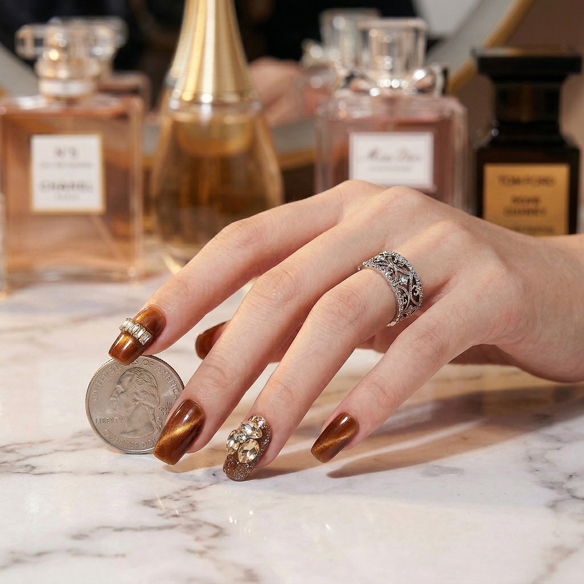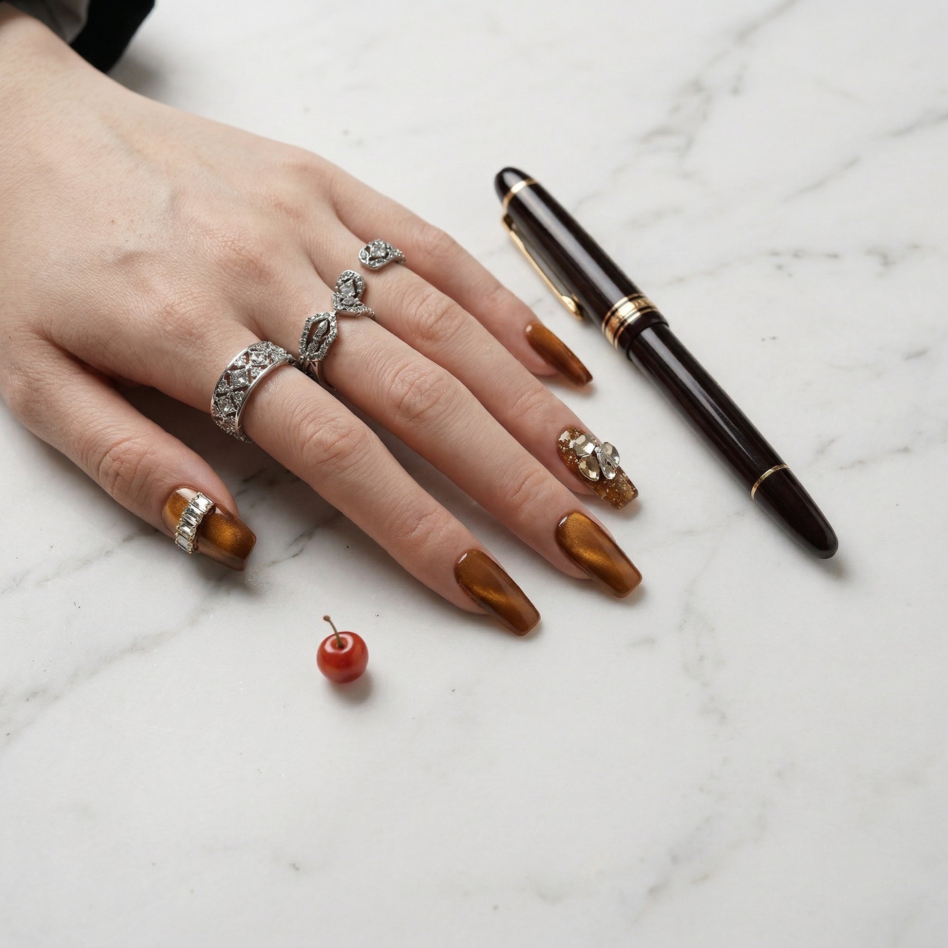 • 10 Hand-Painted Nails (Amber Cat Eye)