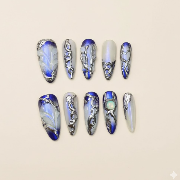 Description Step into a futuristic dream with a set that balances celestial beauty and avant-garde edge. These almond-shaped nails feature a breathtaking deep sapphire gradient melting into an iridescent, milky white base that glows from within. The standout feature is the sculptural 3D chrome silver accents that mimic flowing liquid metal, wrapping around each nail like molten mercury. Centered with a luminous, opal-inspired gem that shifts with every movement, this design evokes a sense of galactic luxury. Perfect for the trendsetter looking to channel a high-fashion cyber-chic aesthetic, these nails offer a multidimensional finish that commands attention in any setting.