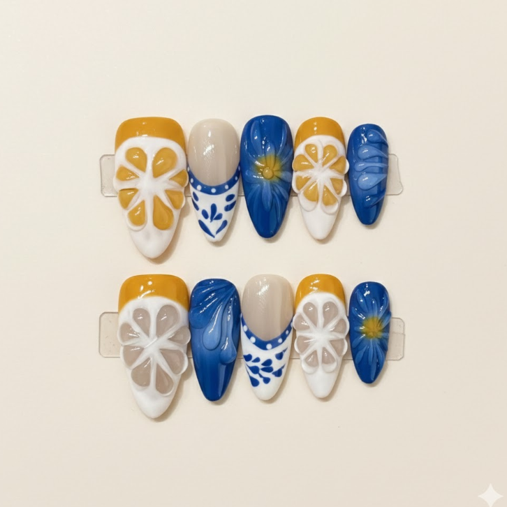 Description Transport yourself to the sun-drenched shores of the Amalfi Coast with this artisanal press on nail set. Featuring a vibrant palette of Mediterranean blue and zesty lemon yellow, these nails are a celebration of coastal luxury. Intricate 3D citrus slices and textured azure blossoms pop against a crisp white and neutral canvas, while delicate hand-painted tile patterns evoke the charm of traditional Italian pottery. The high-gloss finish enhances the rich pigment and sculptural details, creating a dynamic, tactile aesthetic. Perfect for the woman who loves a fresh, vacation-ready look, these nails blend bohemian artistry with sophisticated summer elegance for a truly unforgettable statement.