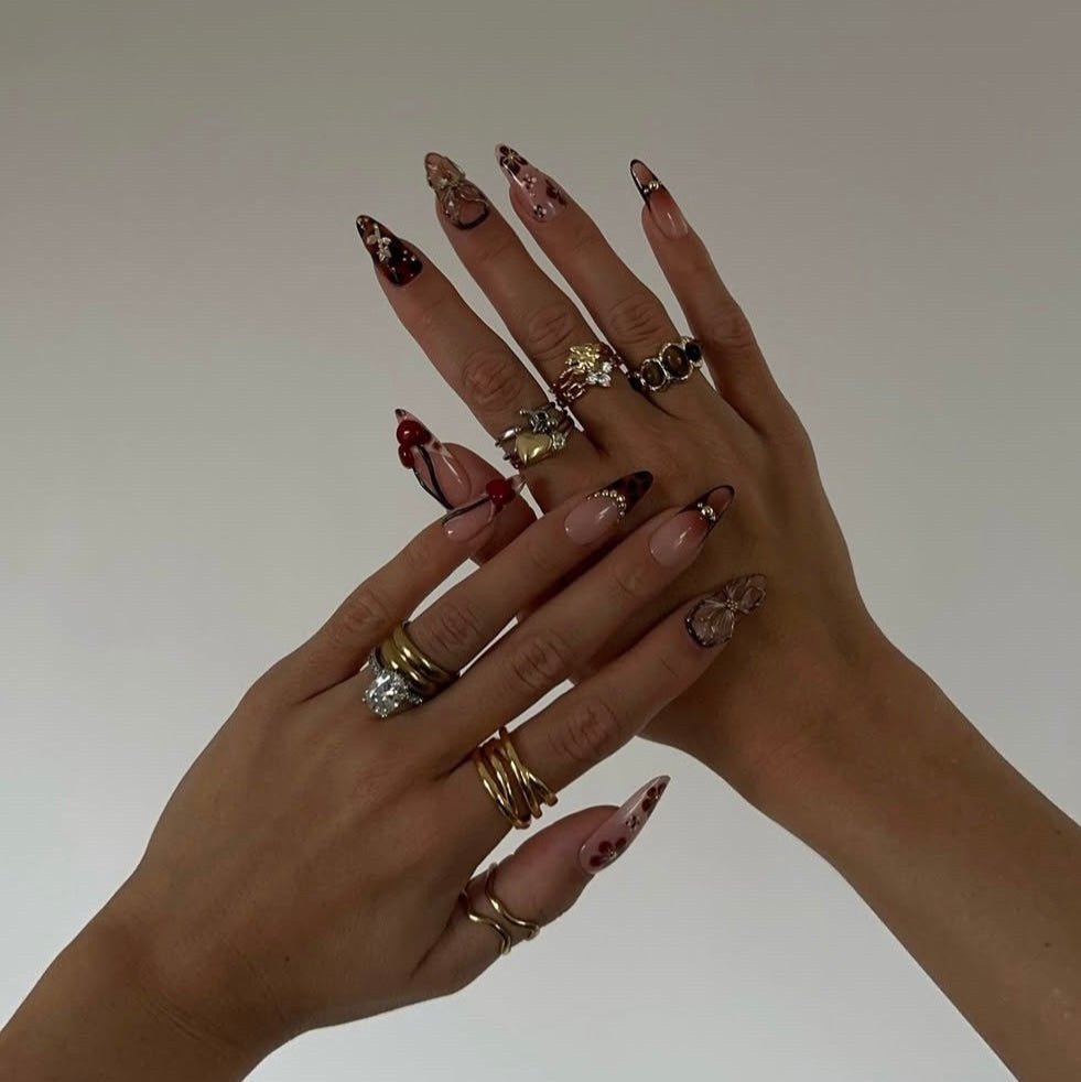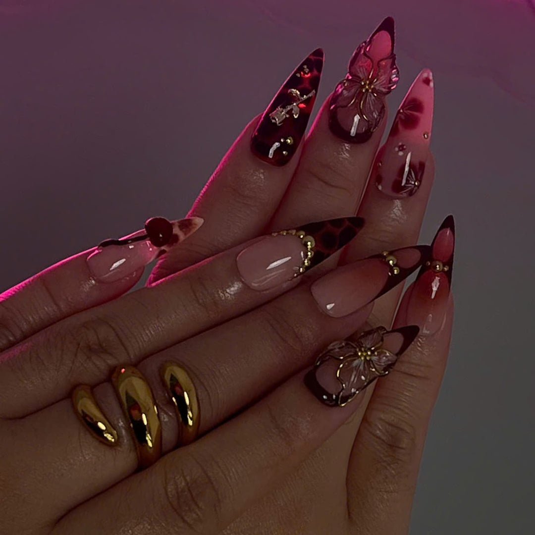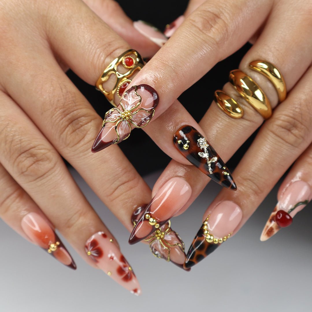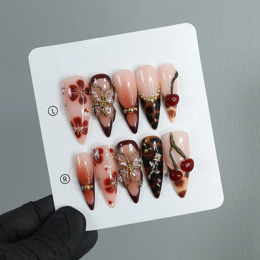 Indulge in elegance with the Scarlet Reverie Handmade Press-On Nails. This stunning set features rich nude and deep brown tones, accented with delicate 3D florals, gold embellishments, and charming cherry designs. Perfect for special occasions, holidays, or simply when you want to feel effortlessly chic and confident.