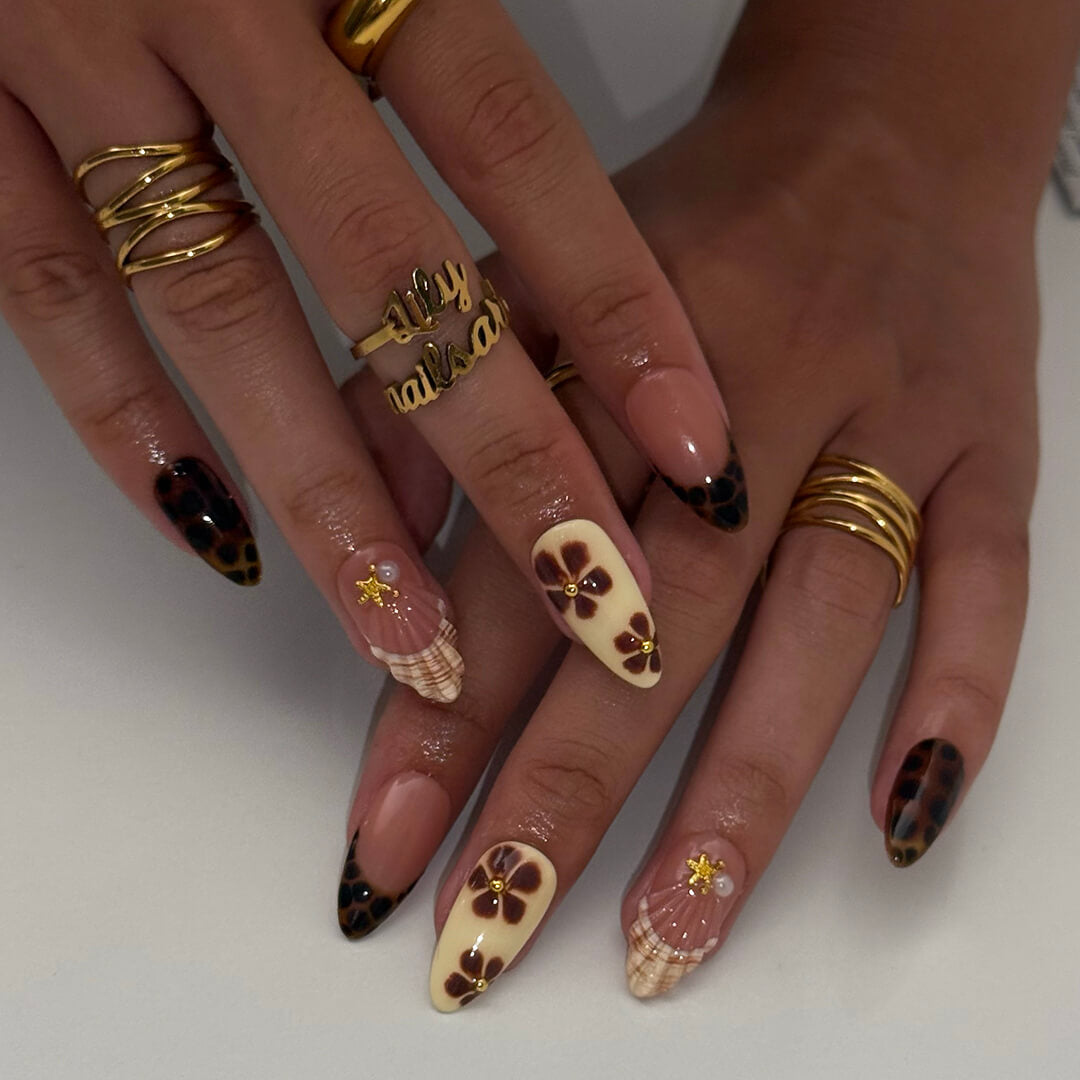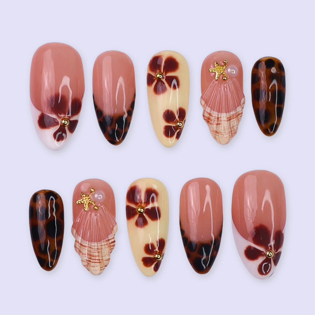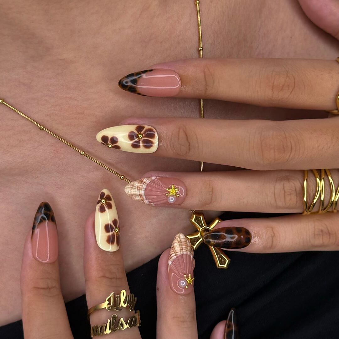 This set pairs glossy mocha browns, creamy nudes, and tortoiseshell tips with hand-painted florals and subtle golden accents. Soft petals bloom across neutral tones, while seashell-like textures and leopard hints add depth and character. It’s a perfect balance of earthy sophistication and feminine detail, giving you a look that’s both versatile and timeless.