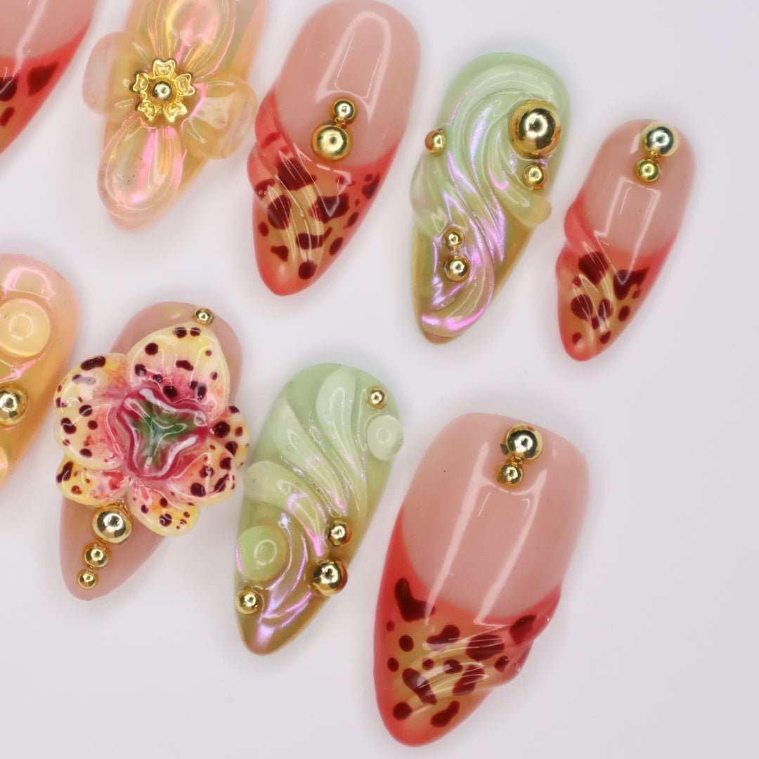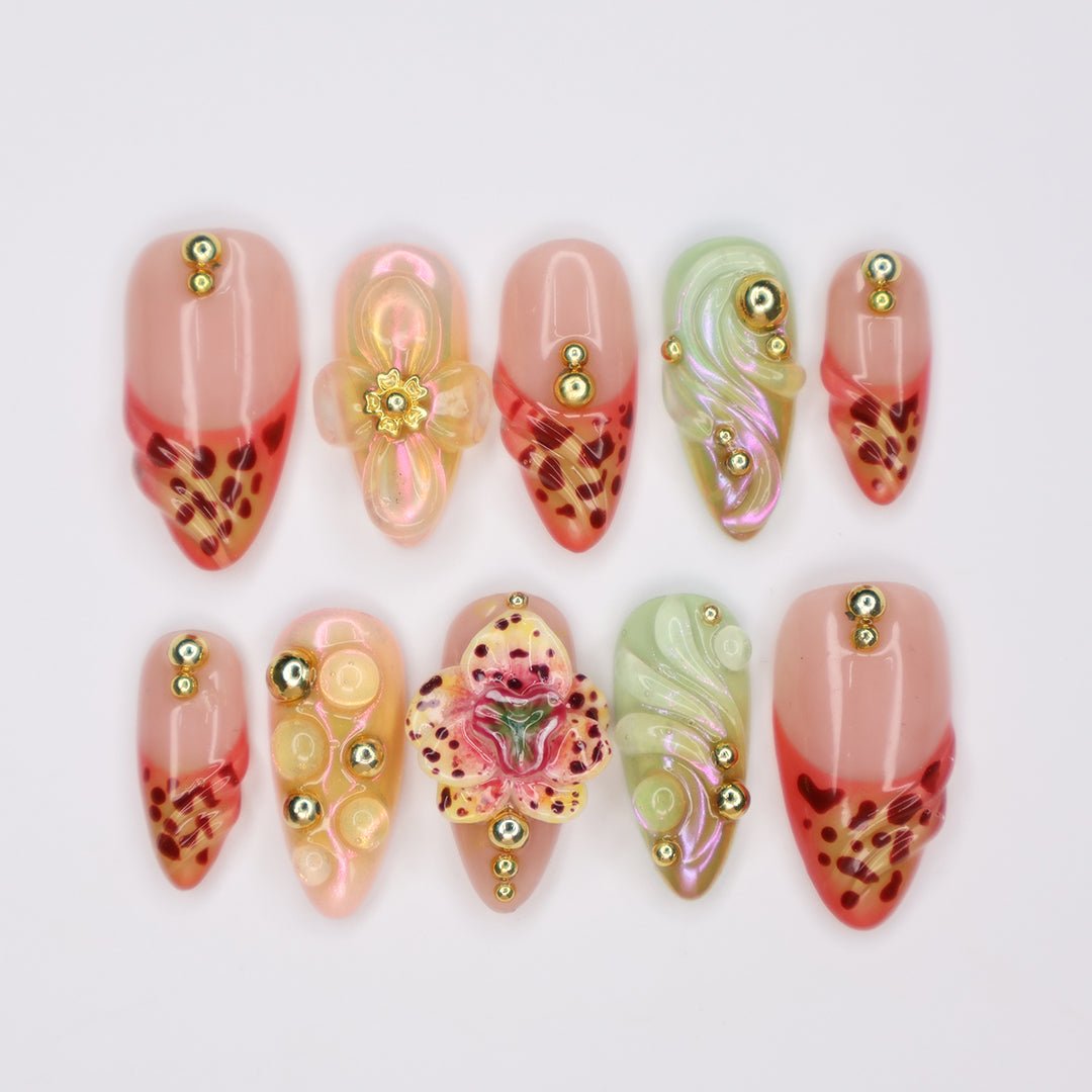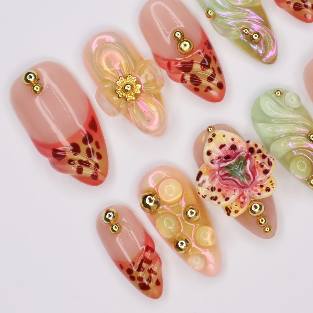 This Tawny Orchid press-on nail set captures the beauty of exotic florals with warm, tawny hues, intricate hand-painted details, and 3D sculpted accents. Featuring shimmering iridescent swirls, delicate orchid-inspired designs, and elegant gold embellishments, this set brings a touch of tropical glamour to your fingertips.