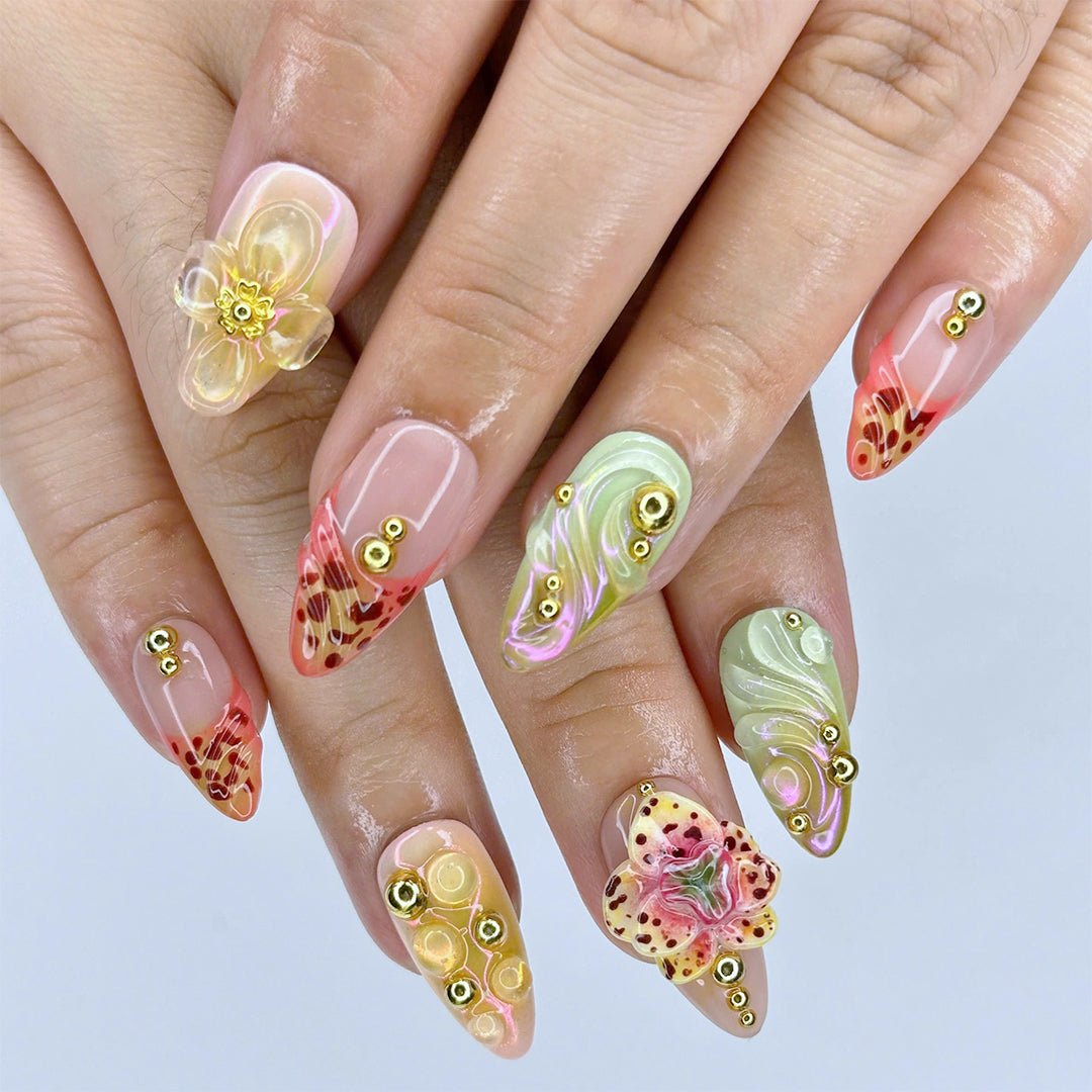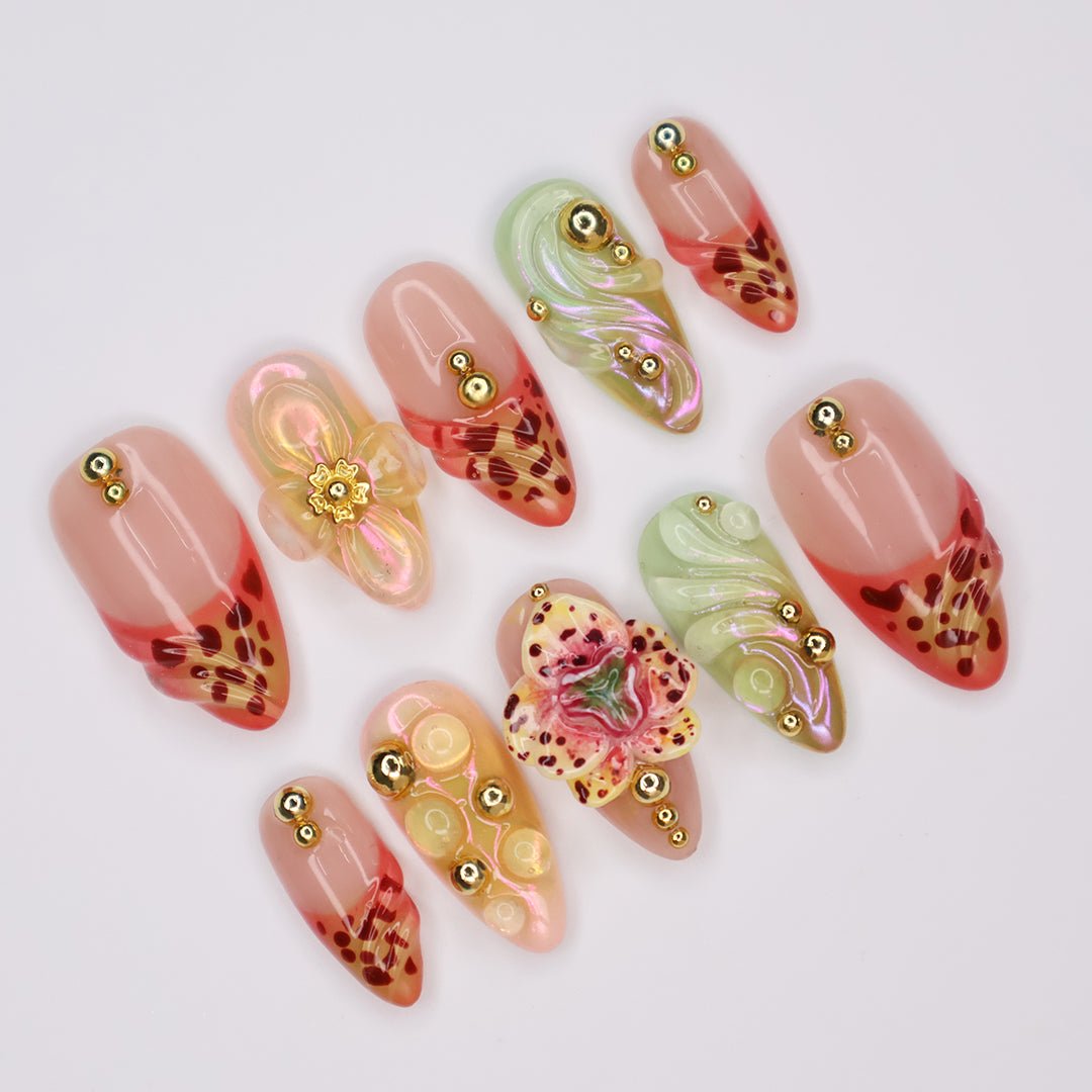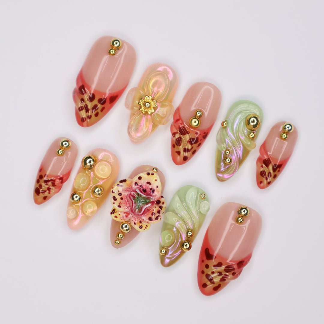 This Tawny Orchid press-on nail set captures the beauty of exotic florals with warm, tawny hues, intricate hand-painted details, and 3D sculpted accents. Featuring shimmering iridescent swirls, delicate orchid-inspired designs, and elegant gold embellishments, this set brings a touch of tropical glamour to your fingertips.