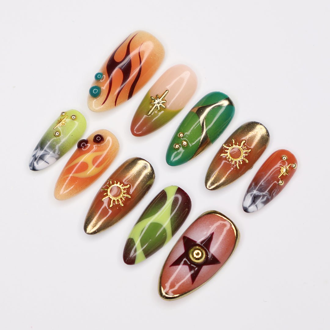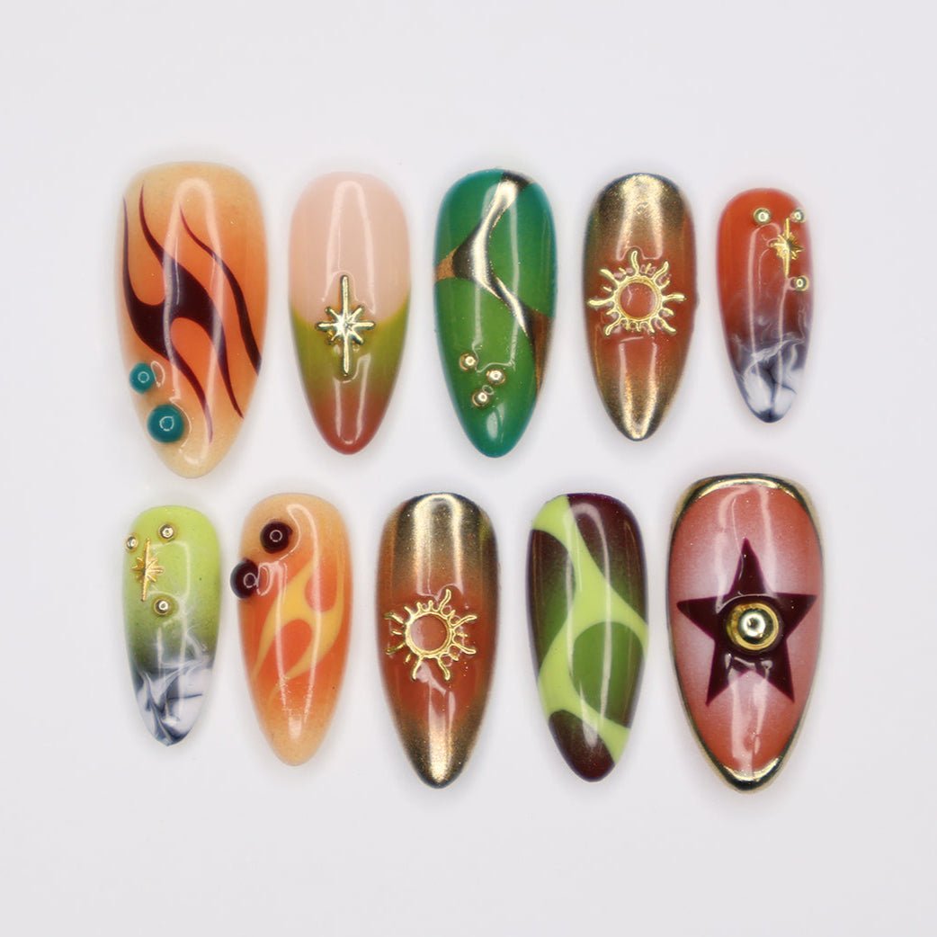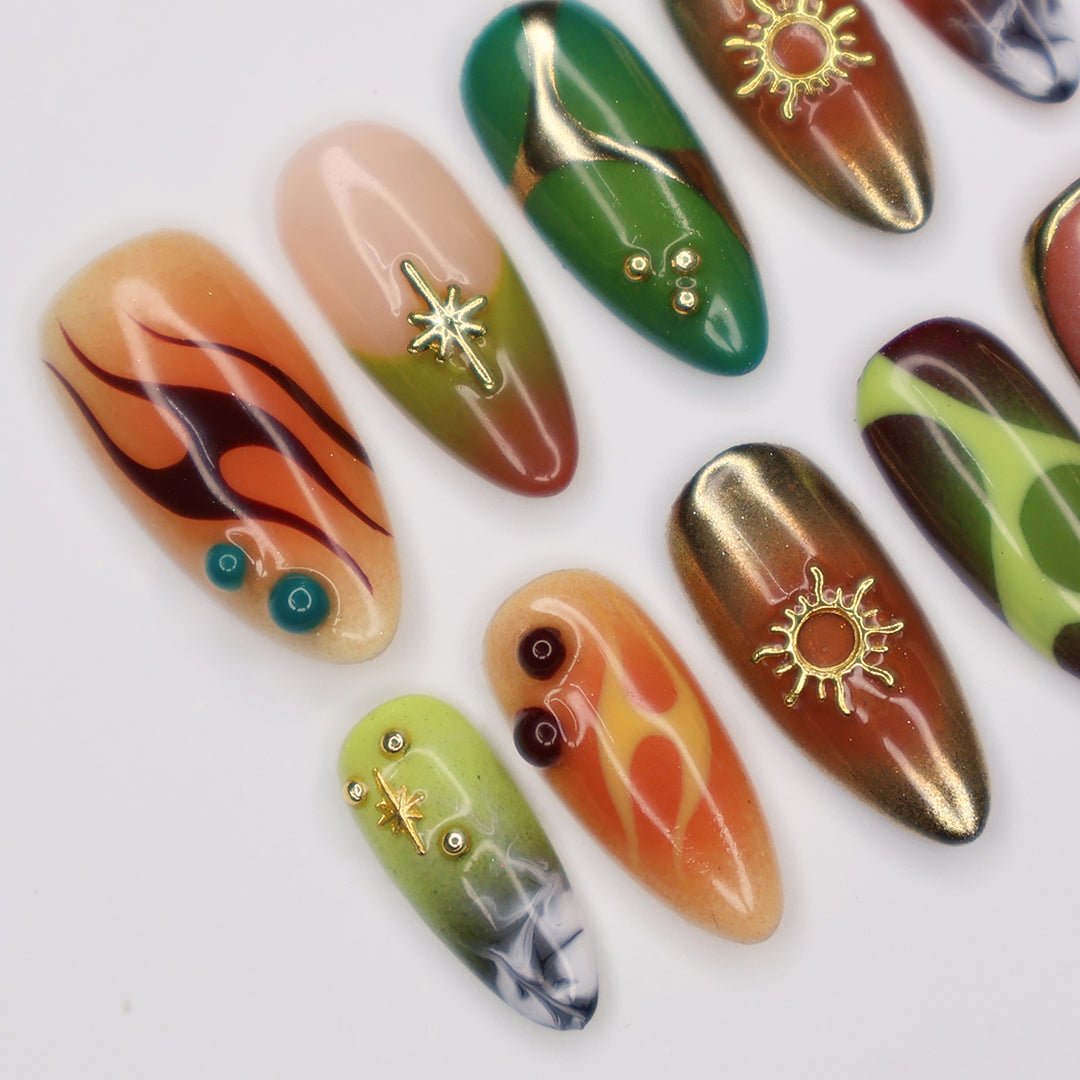 This Maple Magic press-on nail set captures the cozy essence of autumn with a rich blend of earthy greens, warm amber, and deep burgundy tones. Swirling patterns, golden sun charms, and intricate star details bring a celestial touch to this fall-inspired set. Perfect for crisp autumn days, bonfire nights, seasonal gatherings, or simply embracing the magic of fall in style. Easy to apply, reusable, and designed to make a bold yet elegant statement all season long! 🍂💅