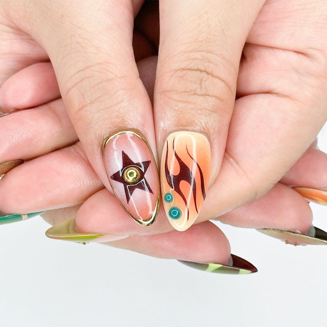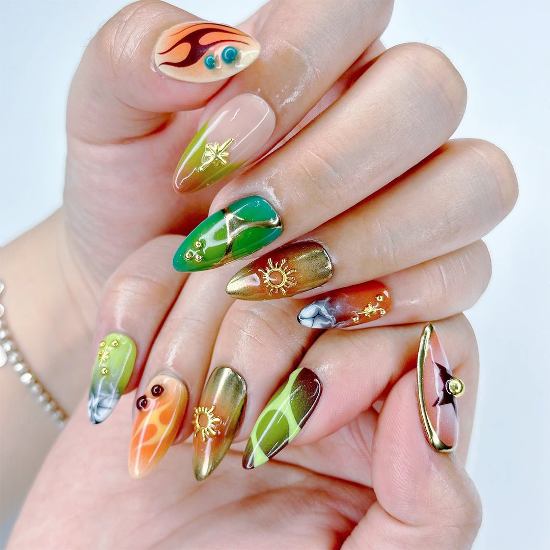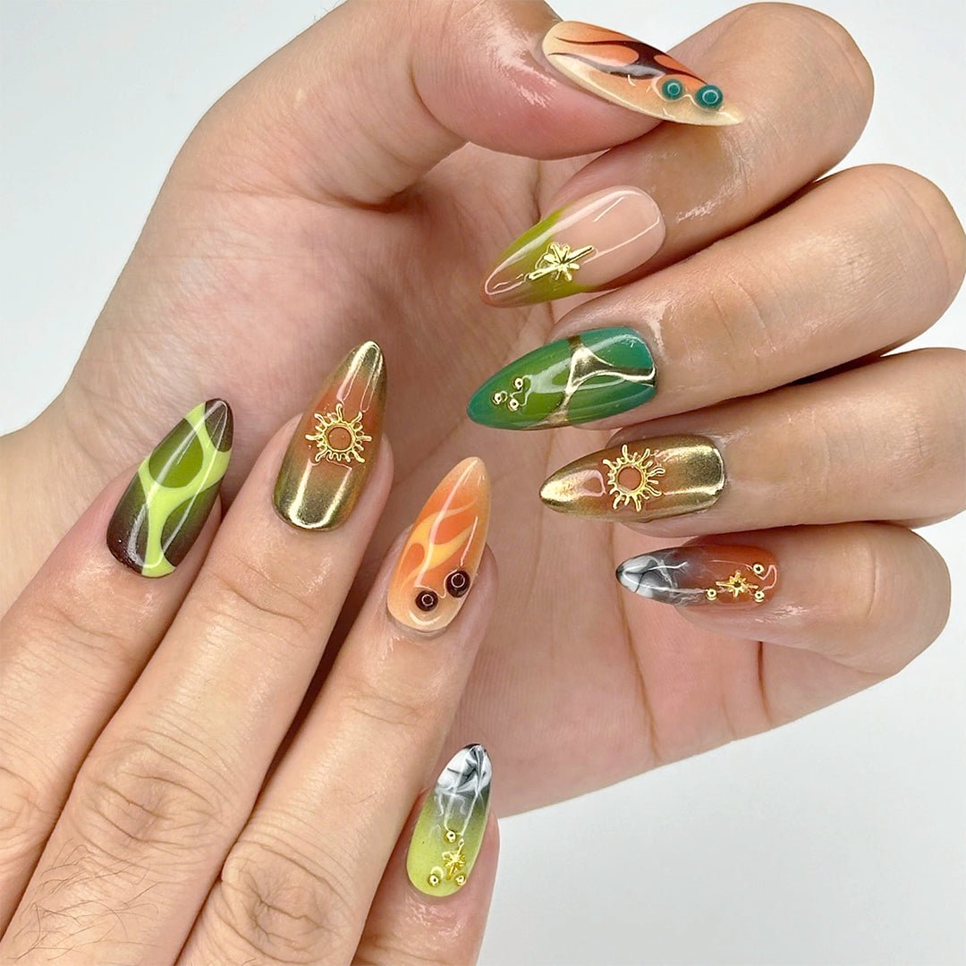 This Maple Magic press-on nail set captures the cozy essence of autumn with a rich blend of earthy greens, warm amber, and deep burgundy tones. Swirling patterns, golden sun charms, and intricate star details bring a celestial touch to this fall-inspired set. Perfect for crisp autumn days, bonfire nights, seasonal gatherings, or simply embracing the magic of fall in style. Easy to apply, reusable, and designed to make a bold yet elegant statement all season long! 🍂💅