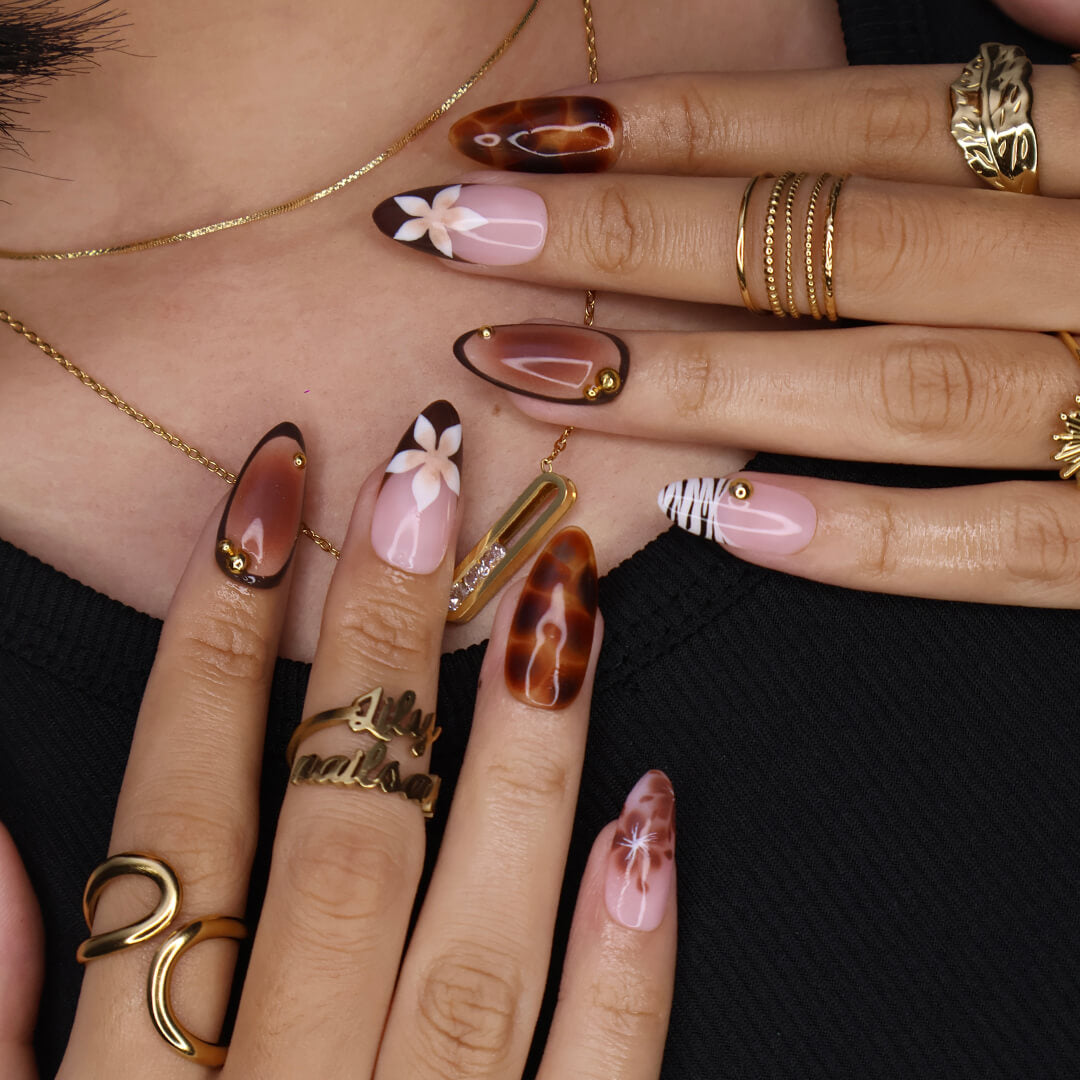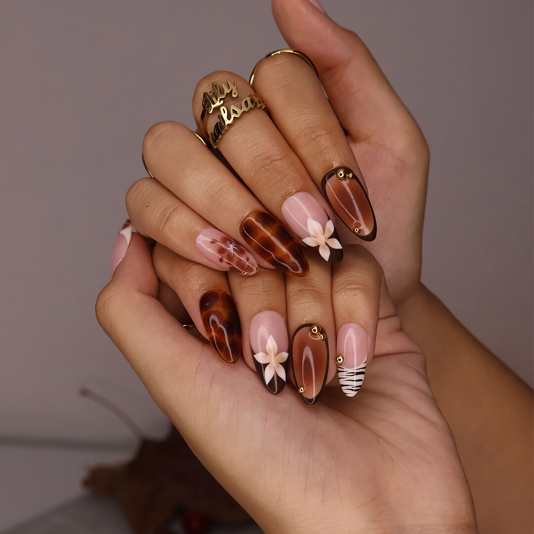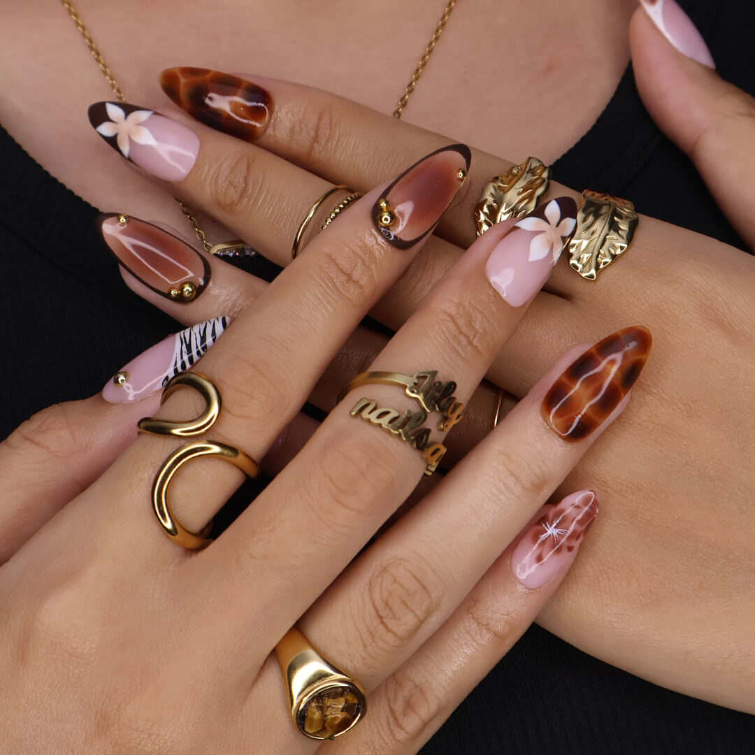 The Wild Love Handmade Press-On Nails blend timeless style with a daring edge. Featuring soft nude pink tones, striking tortoiseshell patterns, bold zebra stripes, and delicate 3D florals, this set delivers effortless sophistication and fashion-forward flair. Perfect for elevating your everyday look, standing out at events, or gifting someone special.