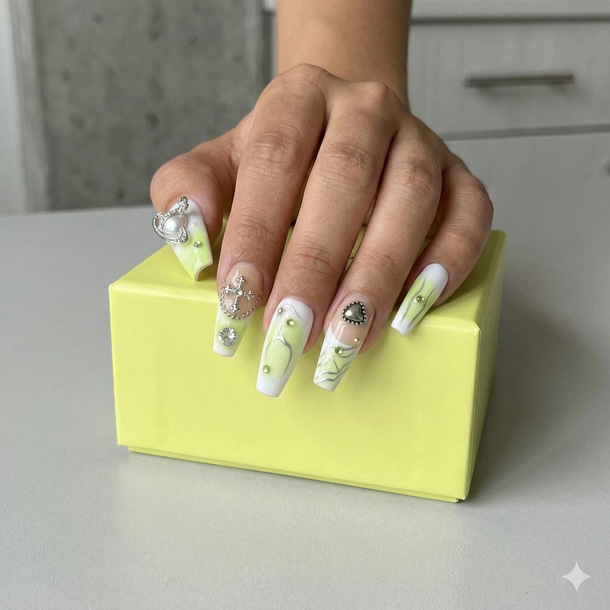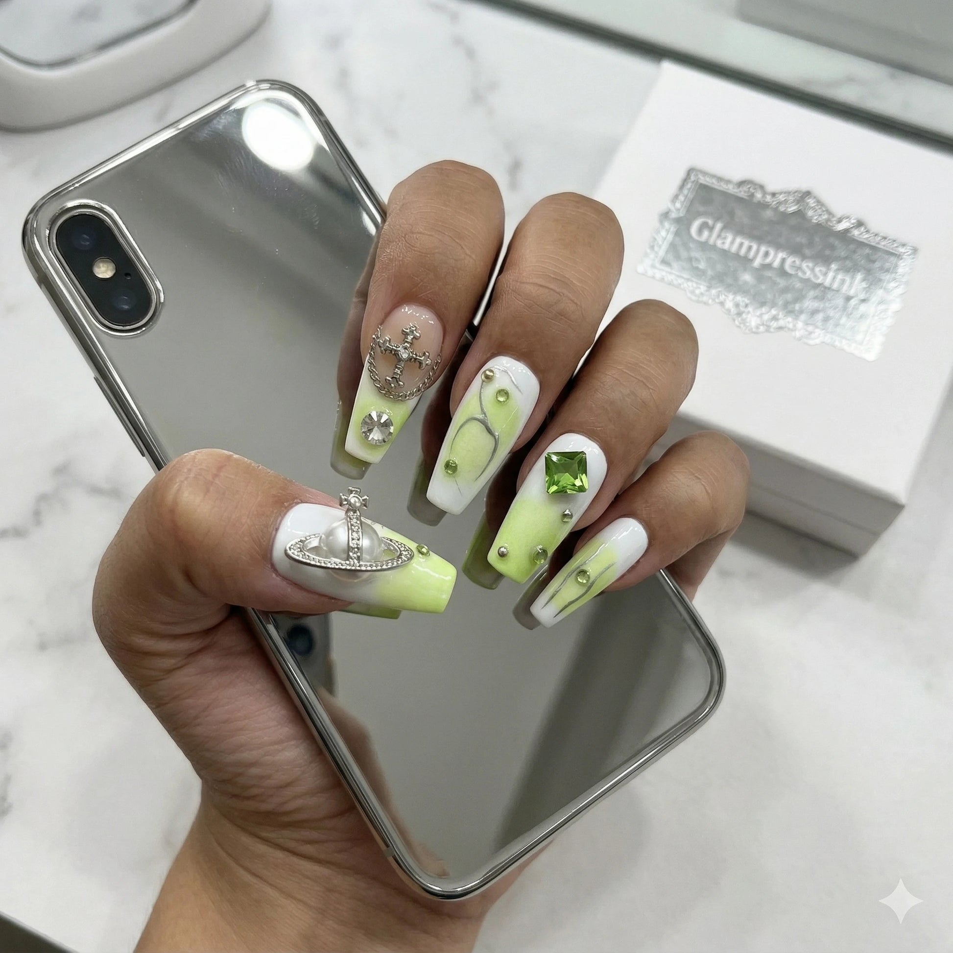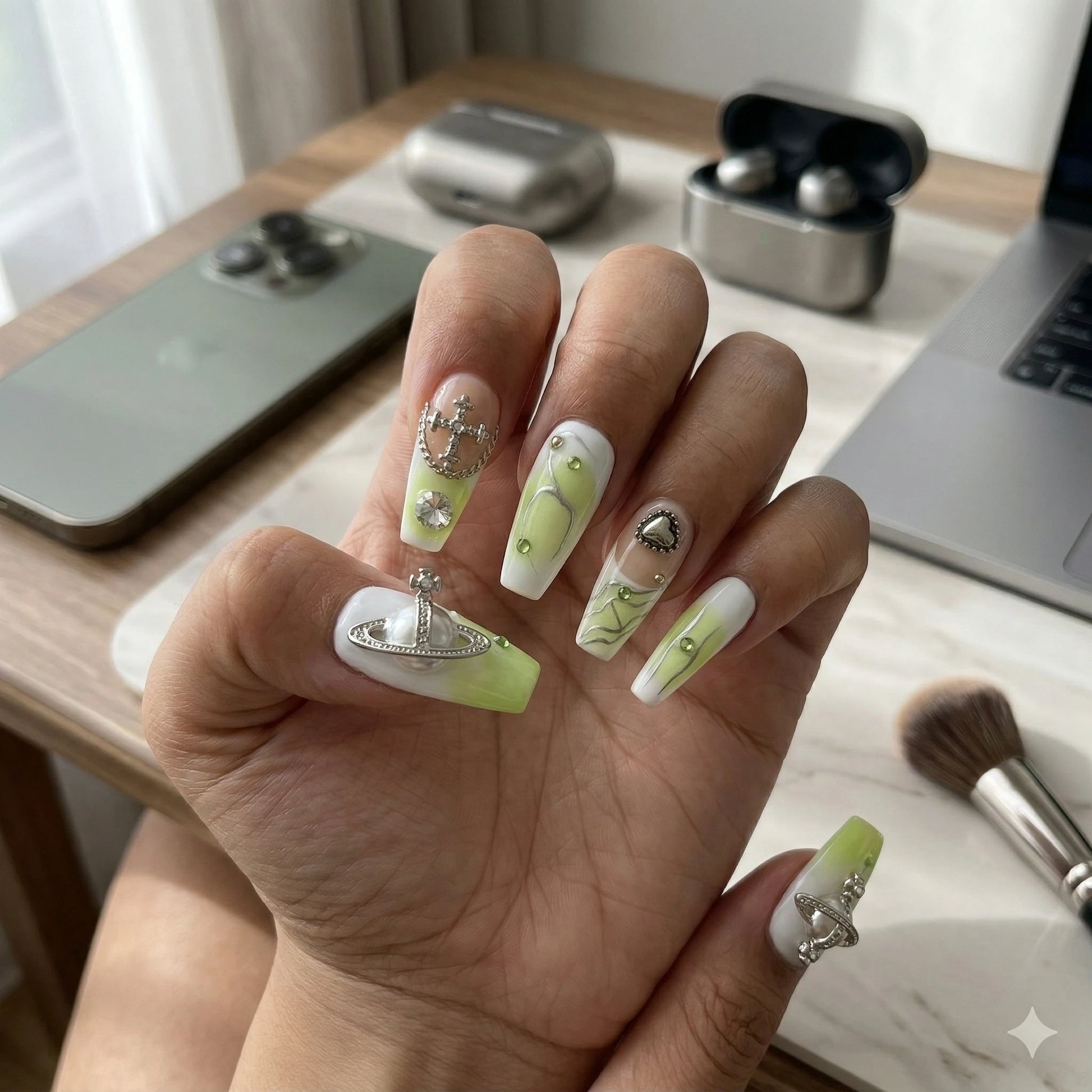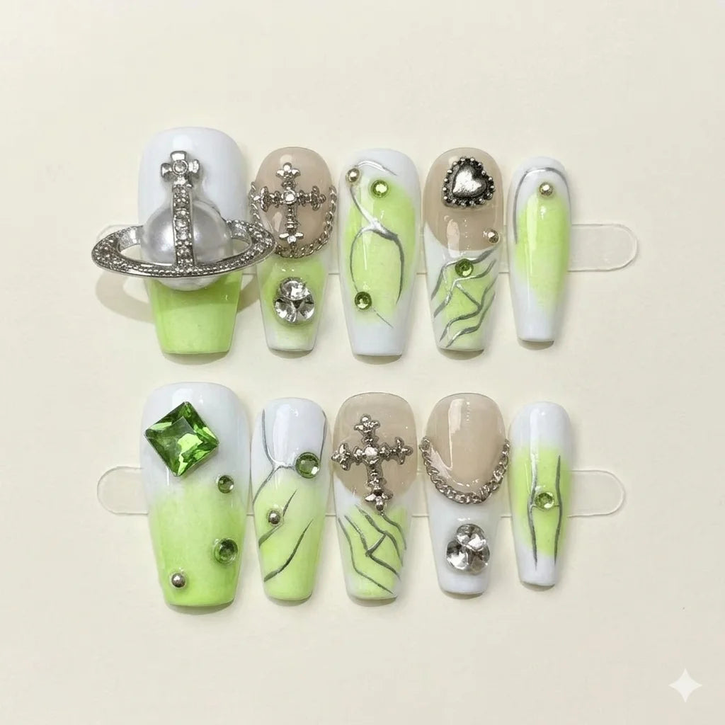 Neon Saturn is for the girl who isn’t afraid to stand out. It’s Y2K energy, high-fashion grunge, and pure edge. A bold blend of toxic lime green, futuristic silver charms, and heavy-duty emerald gems.