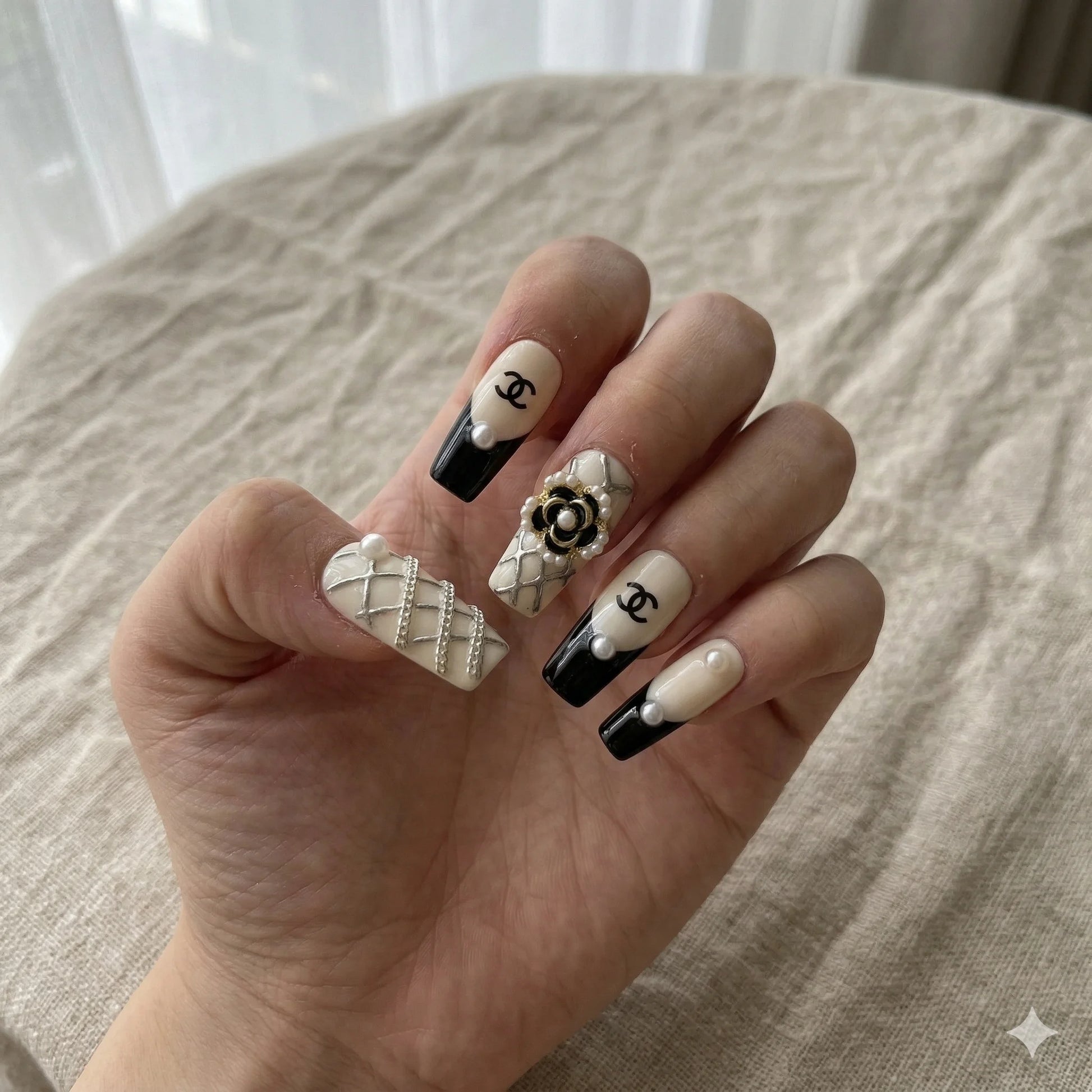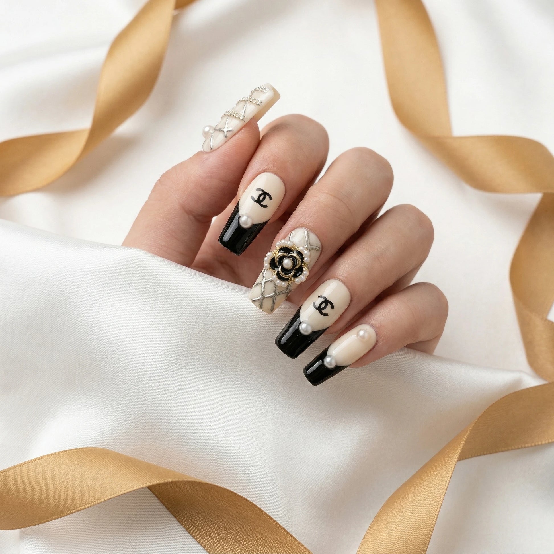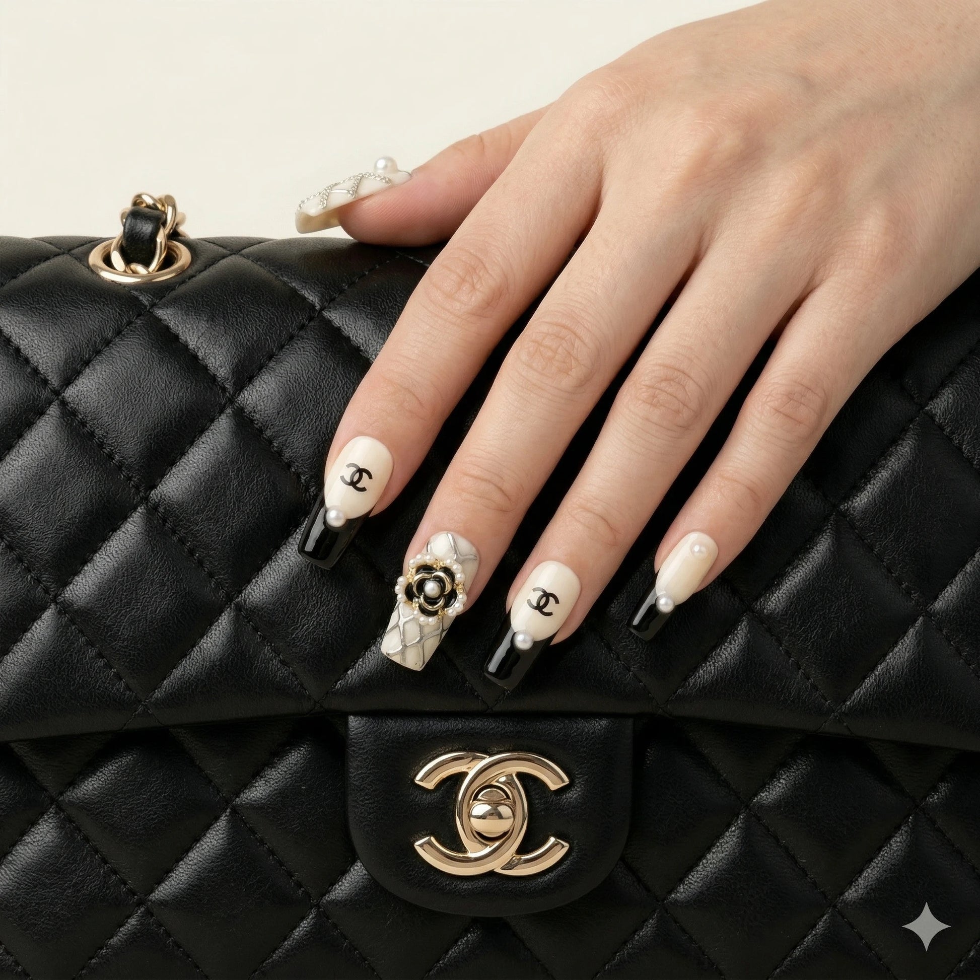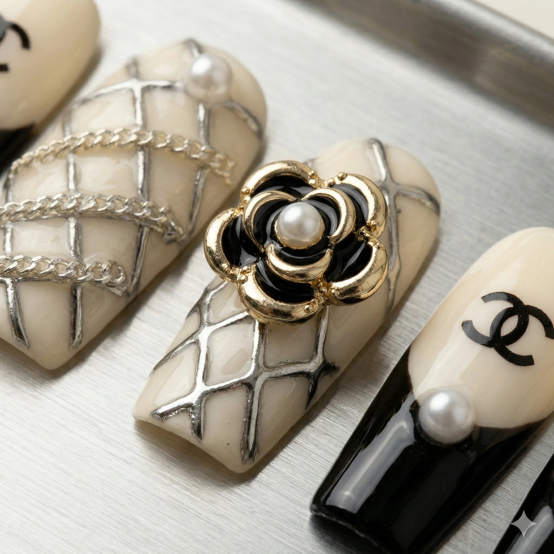 Noir Camellia is more than a manicure; it’s Parisian chic at your fingertips. For the woman who demands elegance in every gesture, this timeless style combines iconic black-and-white tones, artisanal pearls, and hand-placed camellia charms.